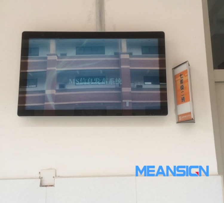在教學(xué)樓每個班級教室門口,安裝電子班牌顯示屏,展示班級名稱、班級課程安排、任課老師、值日表、班級照片、班級活動、班級文化、師生風(fēng)采、班級榮譽、校園通知、校園新聞、各種評比活動,還可以展示一些公共信息如:天氣、日期時間,支持文字、圖片、音視頻樣式。